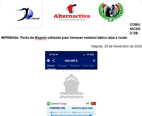 COMUNICADO DE IMPRENSA: Porto de Maputo utilizado para fornecer material bélico letal a Israel